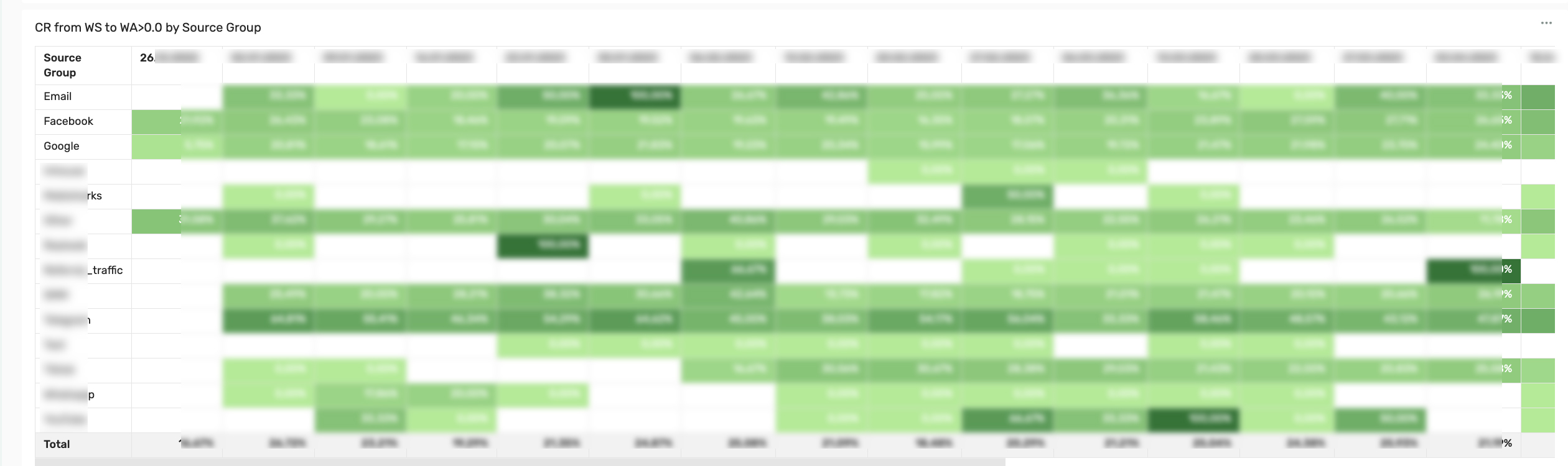 ^^^ This is a very useful table. It shows how conversions differed across different traffic sources over the same period of time, as well as dynamics. Once this dashboard helped me figure out the reason for the drop in conversion (it lay in the launch of a new traffic source).