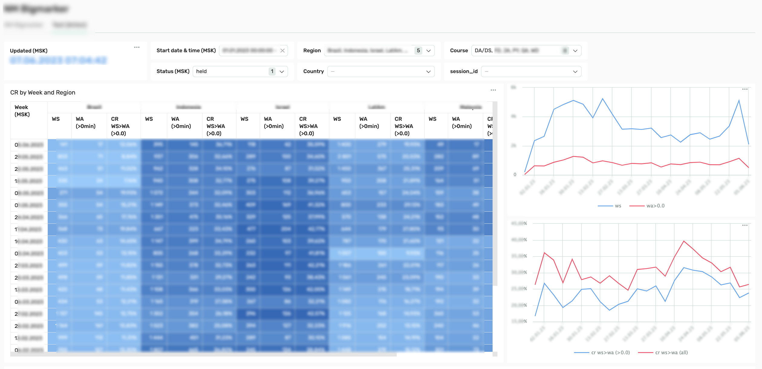 ^^^ Here we see a table with data on webinars, grouped by region and week. The heat map helps us to evaluate the dynamics of indicators and compare by region. The graphs reflect the general dynamics on a weekly basis without breakdown by region.