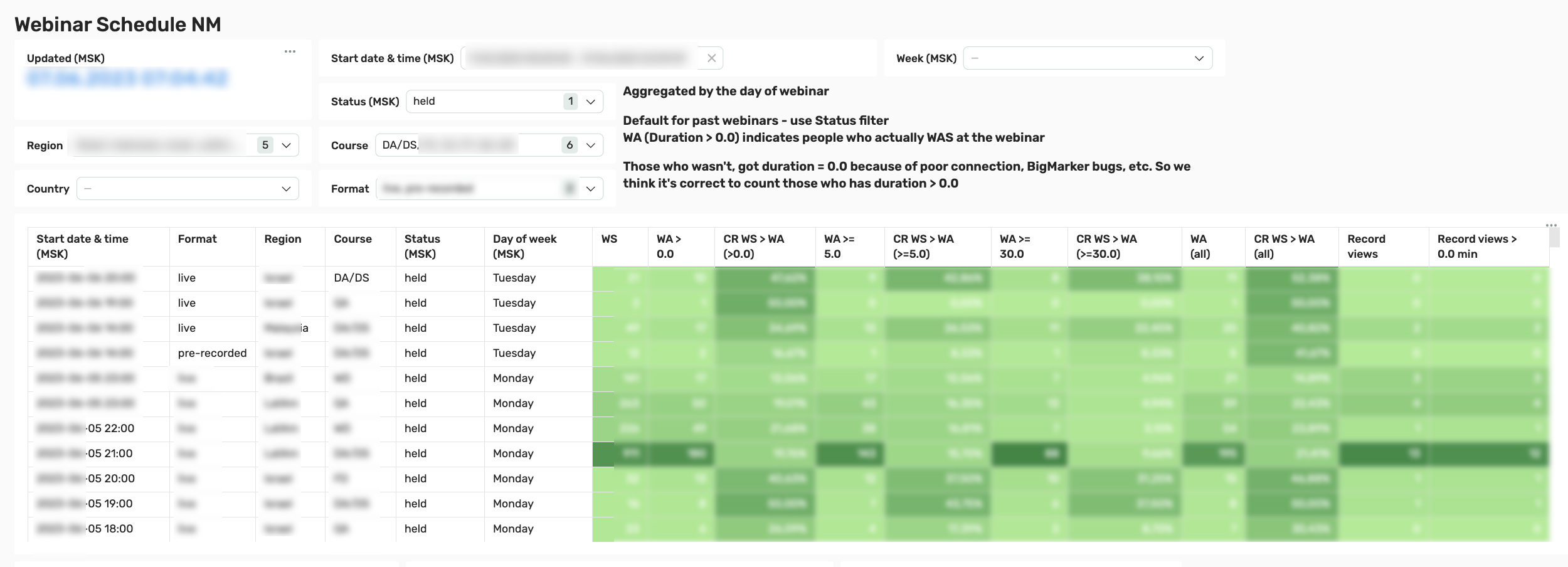 ^^^ Here we can see data for each individual webinar: date and time, live or recorded format, region, course, webinar status, day of the week. The number of registrations, the number of webinar visits (lasting more than zero seconds, 5 minutes, 30 minutes and all), various conversions from registrations to visits, as well as the number of views of recordings.